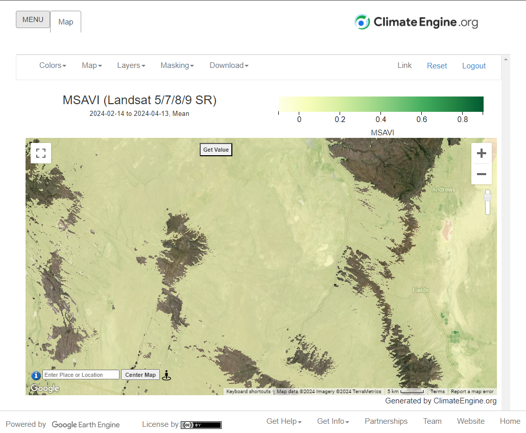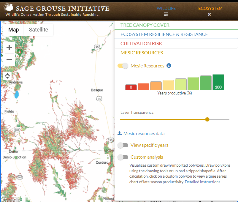 A robust suite of remote sensing products including climate information, drought forecasts, and rangeland vegetation datasets that allow users to assess and monitor landscape change with the most up to date satellite information hosted by Google Earth Engine cloud computing. Expanding upon the capabilities of the SGI Mesic Resources Map, Climate Engine can be used to not only assess where mesic resources are on the landscape using NDVI with near real time data, but also monitor restoration effectiveness by comparing NDVI trends over time to climatic variables like precipitation and temperature to determine whether the change you are seeing on the landscape is a result of management action or climate variation (check out this example video). Thanks to the team at Climate Engine, a late-season mesic productivity map is now available for eastern Oregon through the SageCon Landscape Planning Tool (under the Water folder).