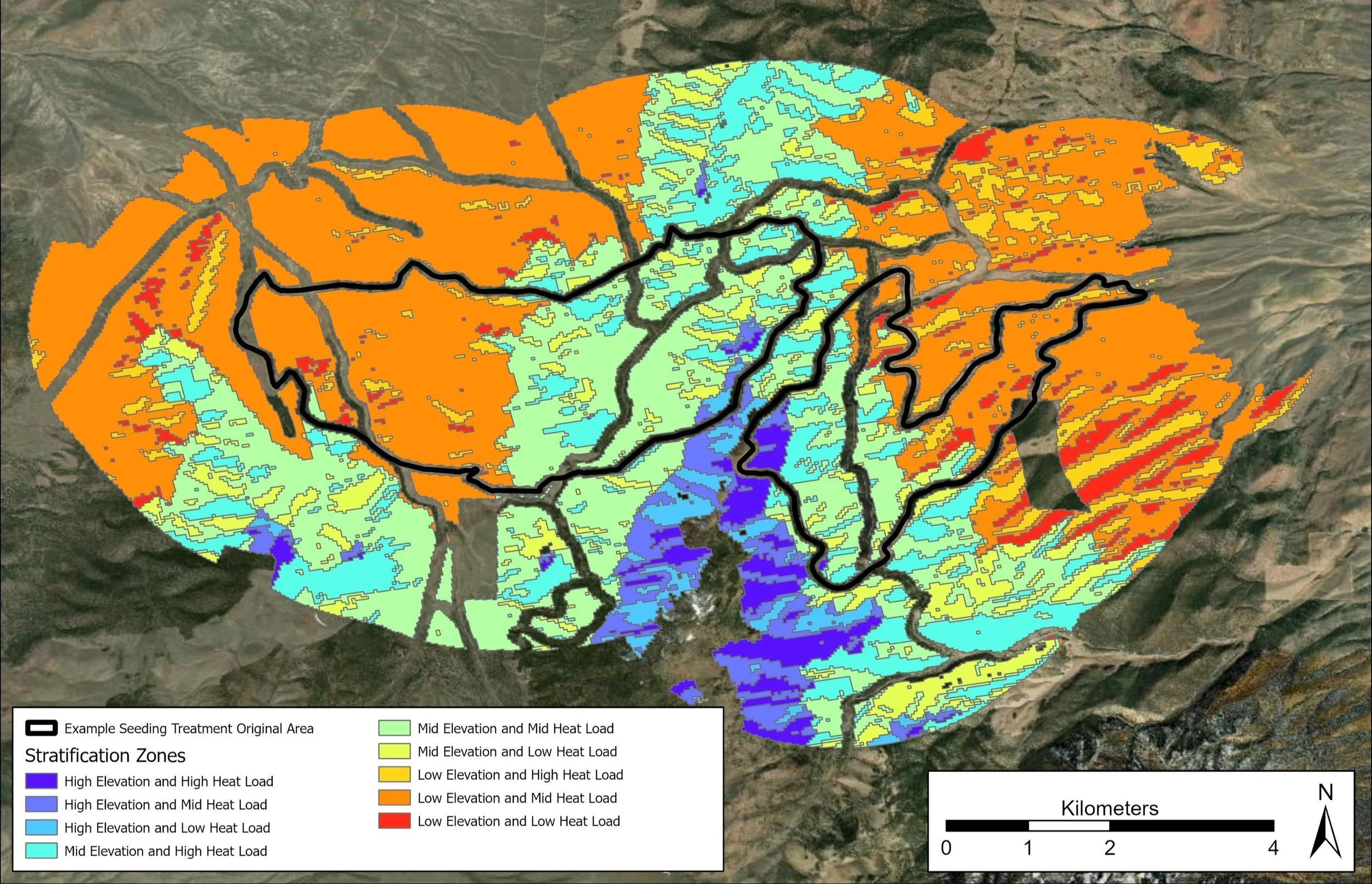 Control (reference) areas are identified within a zone surrounding the treatment area. Both the control and treatment areas are stratified according to elevation and heatload (a metric that incorporates aspect and solar radiation). Heatload and elevation often vary across a treatment, accounting for differences in existing vegetation pre-treatment and potentially variable effectiveness of the restoration treatment.